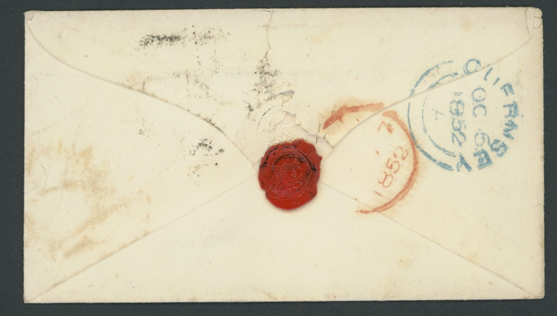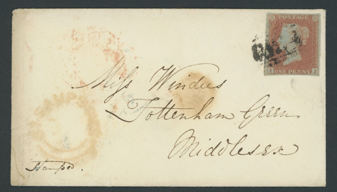 St. Sampson's: 1852 (Oct.) envelope to Tottenham Green bearing 1841-53 1d. red-brown (IJ) diagonal crease, clear margins all round, tied by '324' barred numeral of Guernsey, the envelope struck by 'St. Sampson's' undated double arc handstamp in orange-yellow, the reverse with Guernsey 05.08 d.s. in blue and red arrival marking.  Scarce.