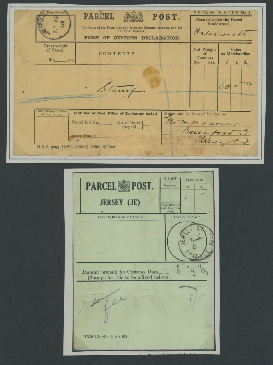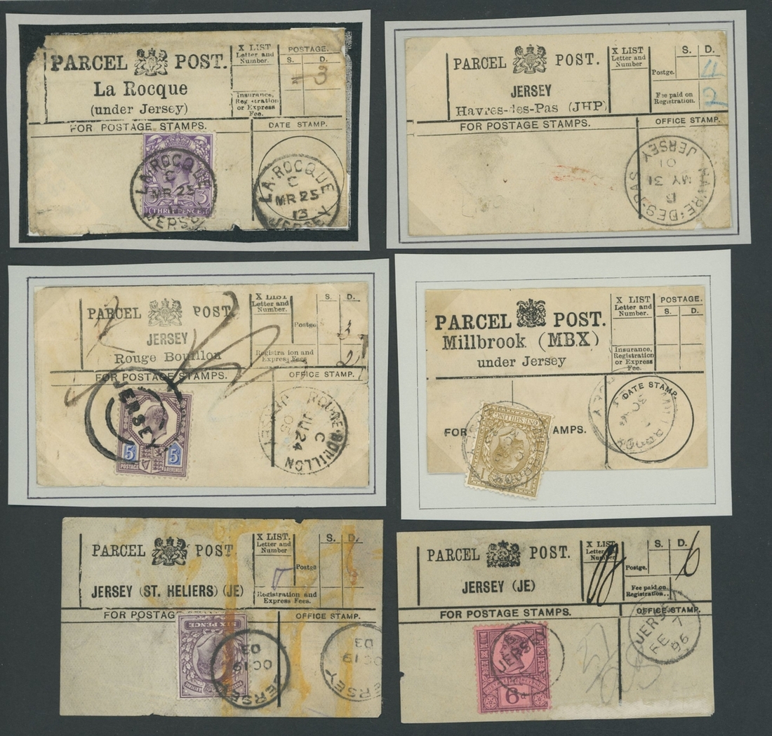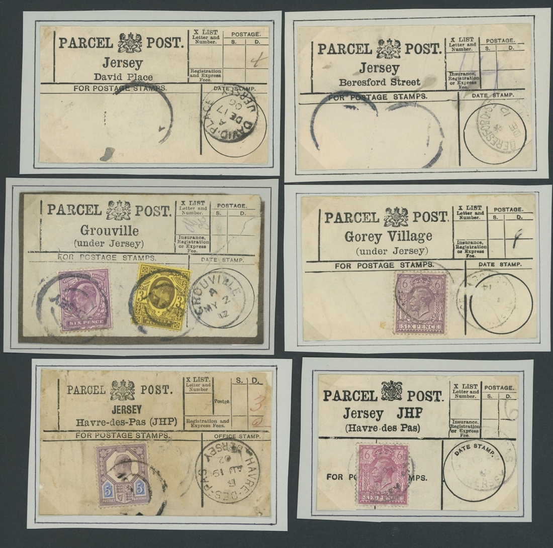 1901-14, a range of Parcel Post labels (20) including "Jersey (JE)" (3), "Jersey (St. Helier's) (JE)" (5), "Jersey Beresford Street", "Jersey David Place", "Gorey Village (under Jersey)", "Grouville (under Jersey)", "Jersey JHP (Havre des Pas)", "Jersey Harve-desPas (JHP)" (2), "La Rocque (under Jersey)", "Millbrook (MBX)"; also Customs Declaration forms (2). The majority with stamps, though some with stamps lifted, a good group.