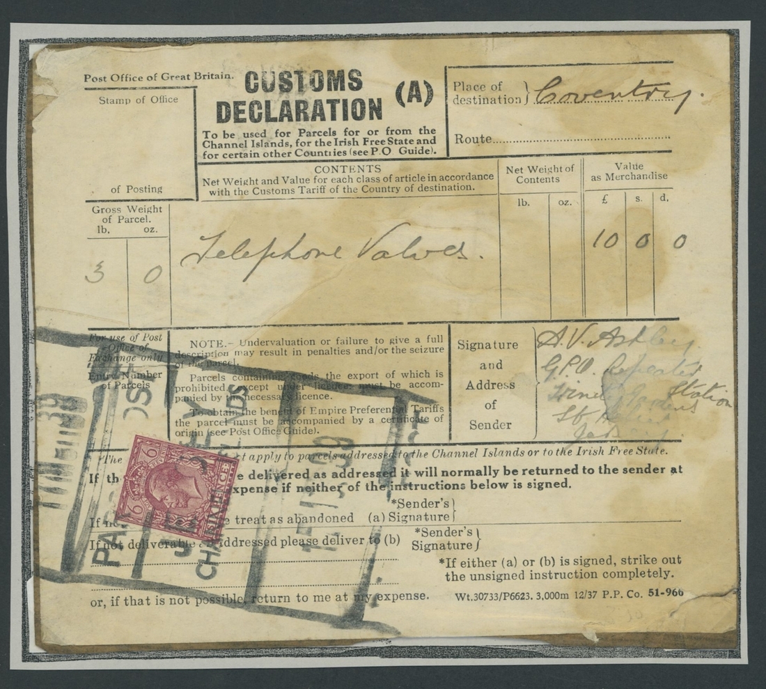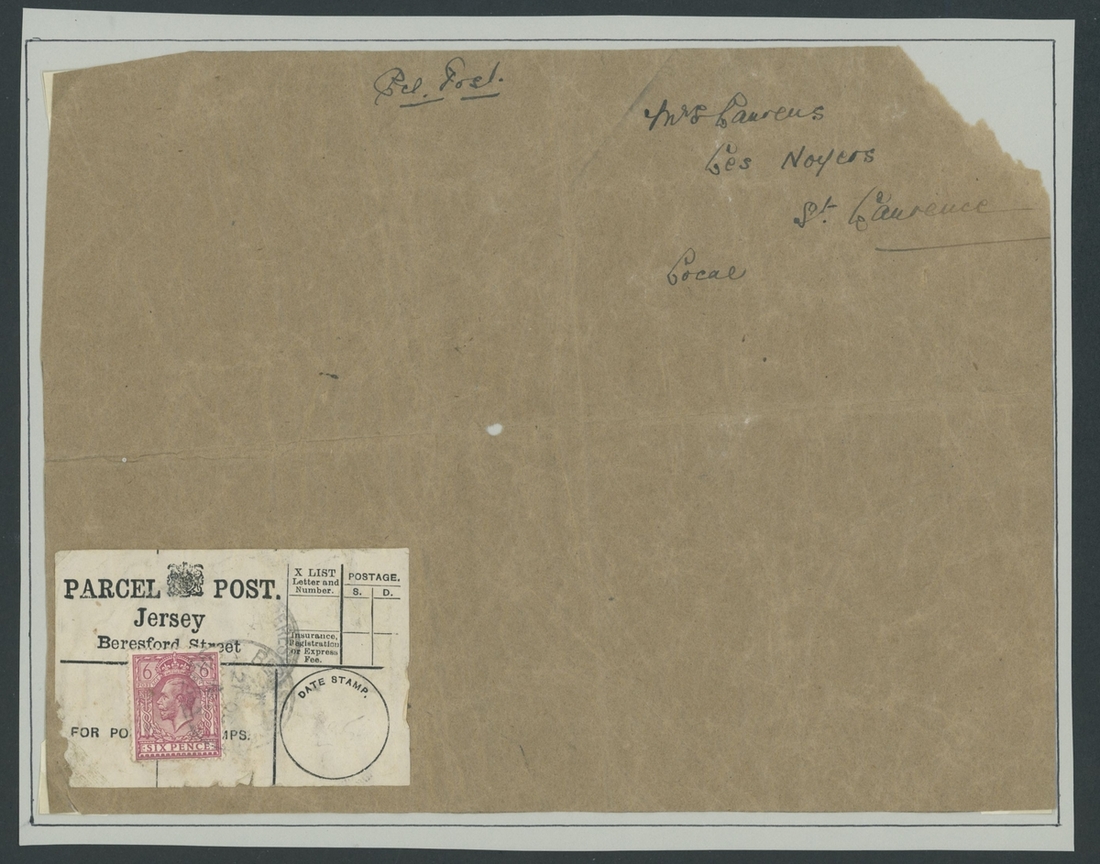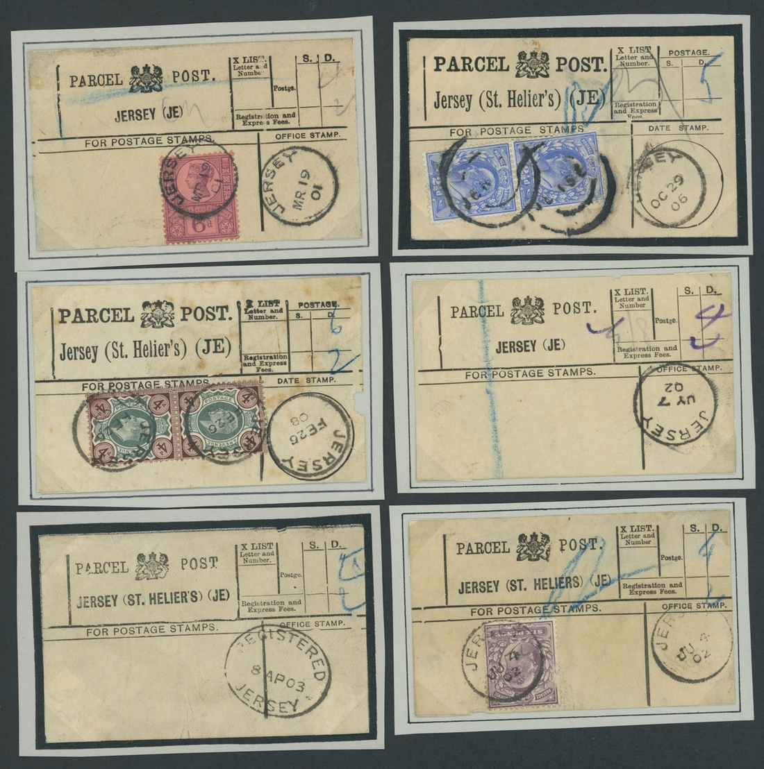 1901-14, a range of Parcel Post labels (20) including "Jersey (JE)" (3), "Jersey (St. Helier's) (JE)" (5), "Jersey Beresford Street", "Jersey David Place", "Gorey Village (under Jersey)", "Grouville (under Jersey)", "Jersey JHP (Havre des Pas)", "Jersey Harve-desPas (JHP)" (2), "La Rocque (under Jersey)", "Millbrook (MBX)"; also Customs Declaration forms (2). The majority with stamps, though some with stamps lifted, a good group.