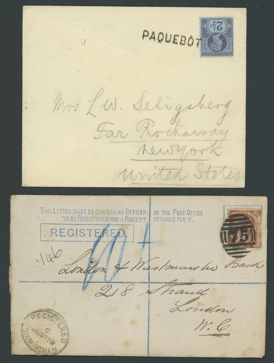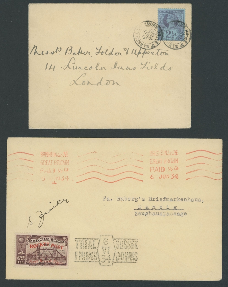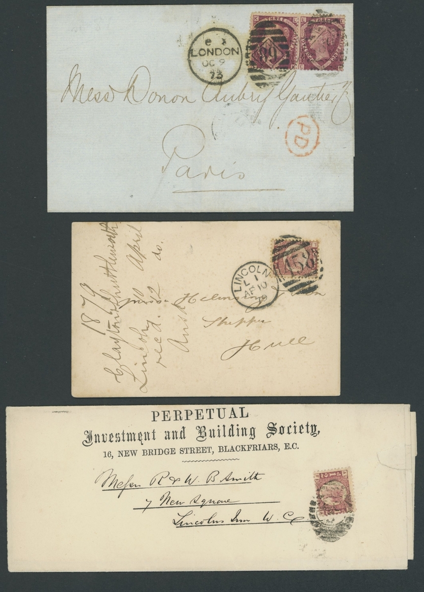 Selection on stockcards and loose, including 1873 entire to Paris franked 1½d. (pair), 1879 Trade card franked ½d., 1879 2d. Registered envelope from Birmingham to London franked 1½d.,, 1890 (c.) Court Bureau 1d. tied to piece, 1895 envelope to New York franked 1887 2½d. tied by Paquebot cancellation, 1898 envelope to London franked 1887 2½d. tied two Marseille Du Rhone datestamps, 1934 Air Mail label Proof block of six without black overprint, 1934 Rocket Post cover from Brighton to Danzig, 1944 German Propaganda forgeries of 1935 Jubilee ½d. and 1937 Coronation 1½d., Nicolas Barony Cigarette card depicting Rowland Hill, Twinings Tea Rare Stamps (series 2) set of 30 cards, etc., chiefly good to fine