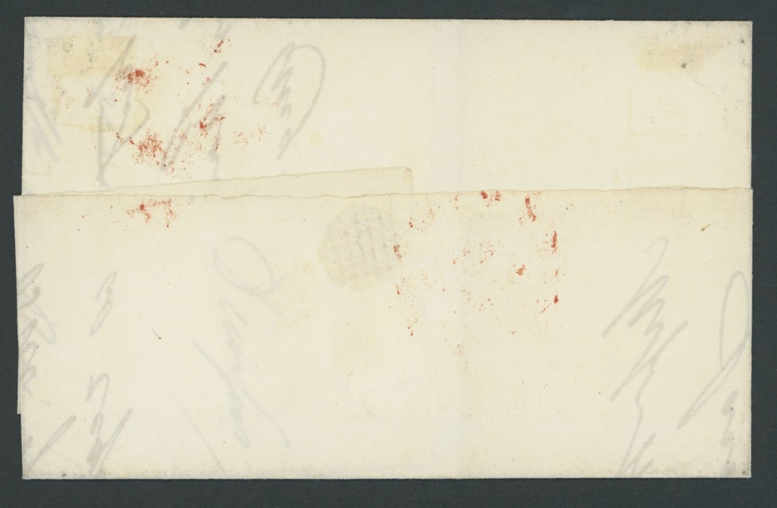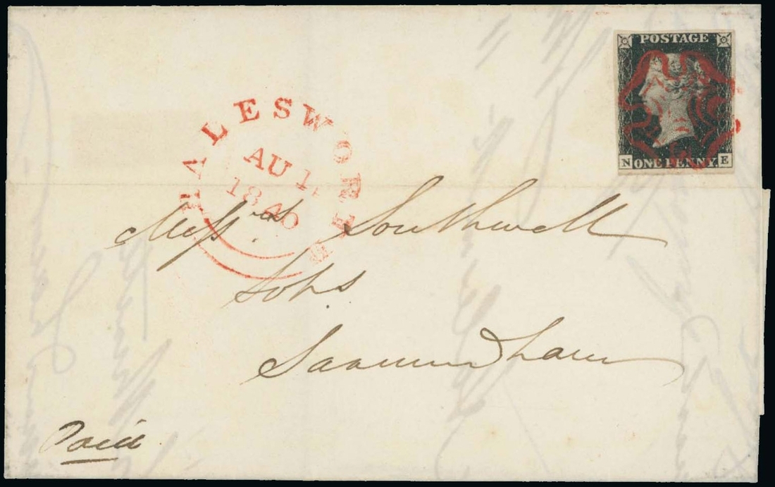 NE, clear margins all round, tied by blood red Maltese Cross of Halesworth to 1840 (11 Aug.) entire letter to Saxmundham, the face with superb Halesworth d.s. in matching ink. Filing fold clear of the adhesive. Very fine and scarce.