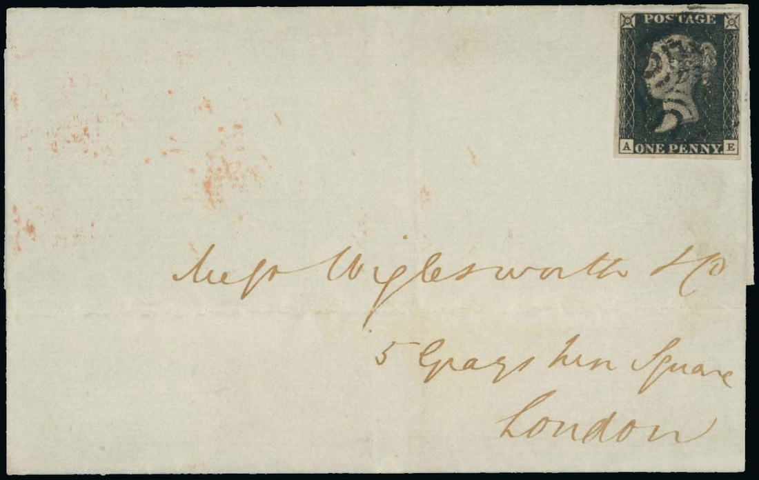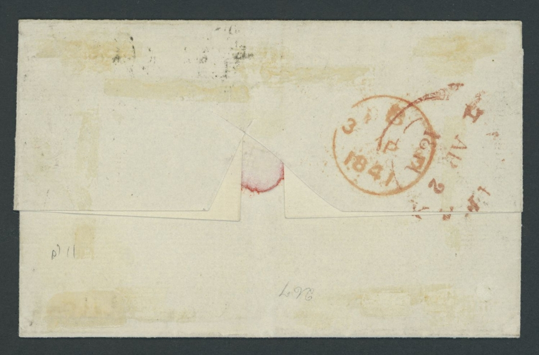 AE, clear margins all round, tied by black Maltese Cross to 1841 (3 April) entire from Halifax to London, the reverse with London and Halifax d.s. Fine and rare. B.P.A. Certificate (1973).
