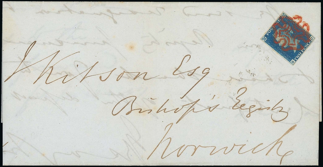 SC, a bright shade, good to large margins all round, placed diagonally and cancelled by a very fine upright Maltese Cross on long entire letter to Norwich, dated markings of July 9 and 10 1840 on the reverse; vertical filing fold well clear of the adhesive; fine and a stunning colour contrast