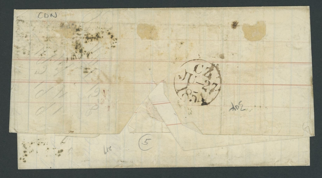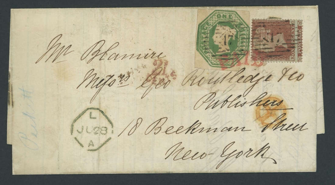 1/- deep green, clear margins all round, just touching at right, affixed alongside perforated 1d. red-brown, tied by '47' barred numeral and horseshoe "