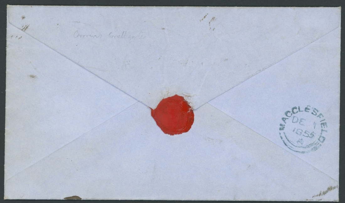 6d. just touched at top, affixed alongside 1855-57 small garter 4d., both tied by Liverpool Registered spoons to 1855 (30 Nov.) envelope to Macclesfield endorsed "Registered", the reverse with Macclesfield d.s.  Fine.