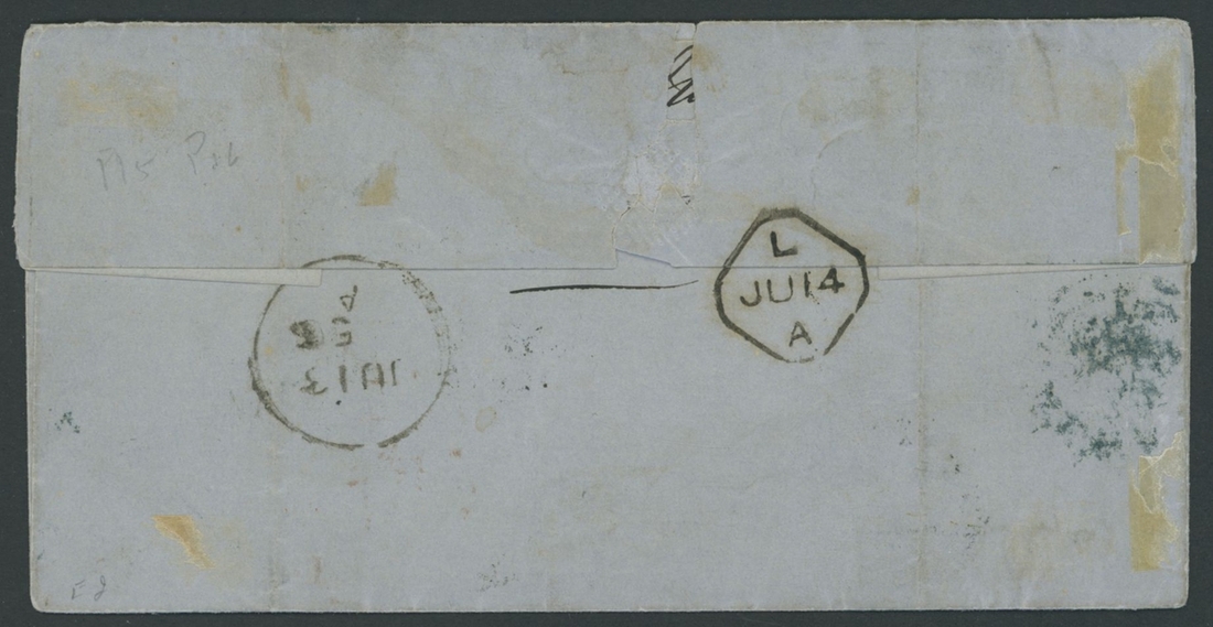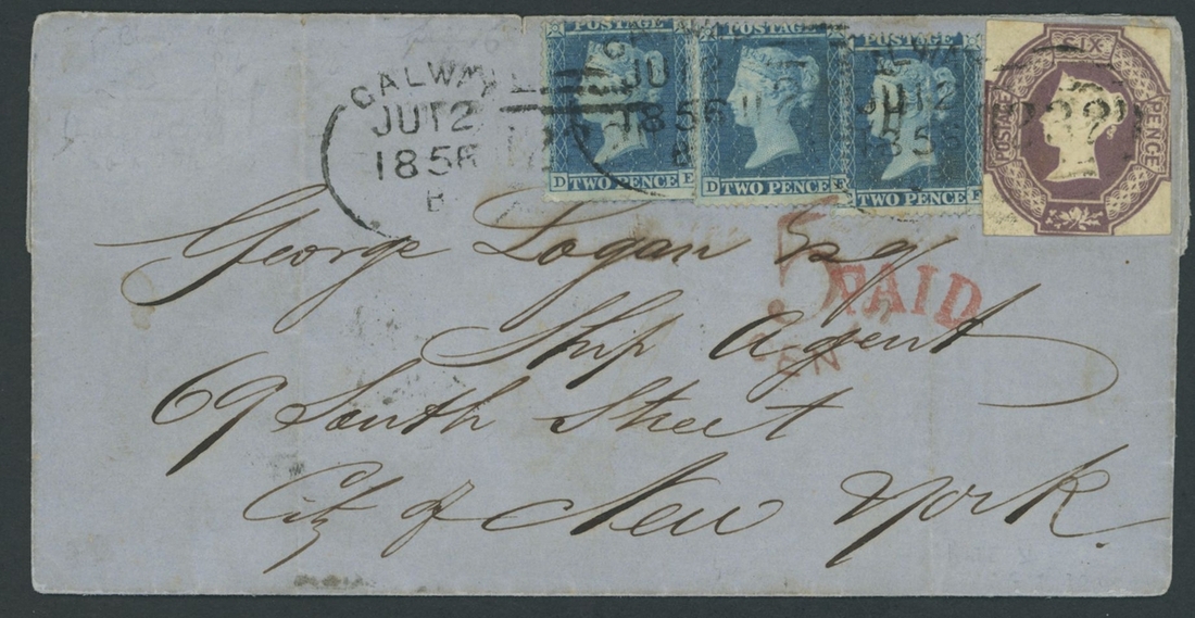 6d. affixed alongside 1854-57 2d. blue singles (3), tied to each other and to 1858 (12 June) Galway entire to New York, the face struck with "