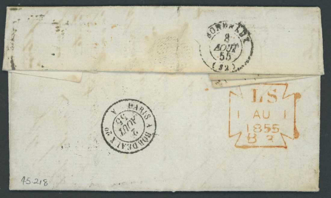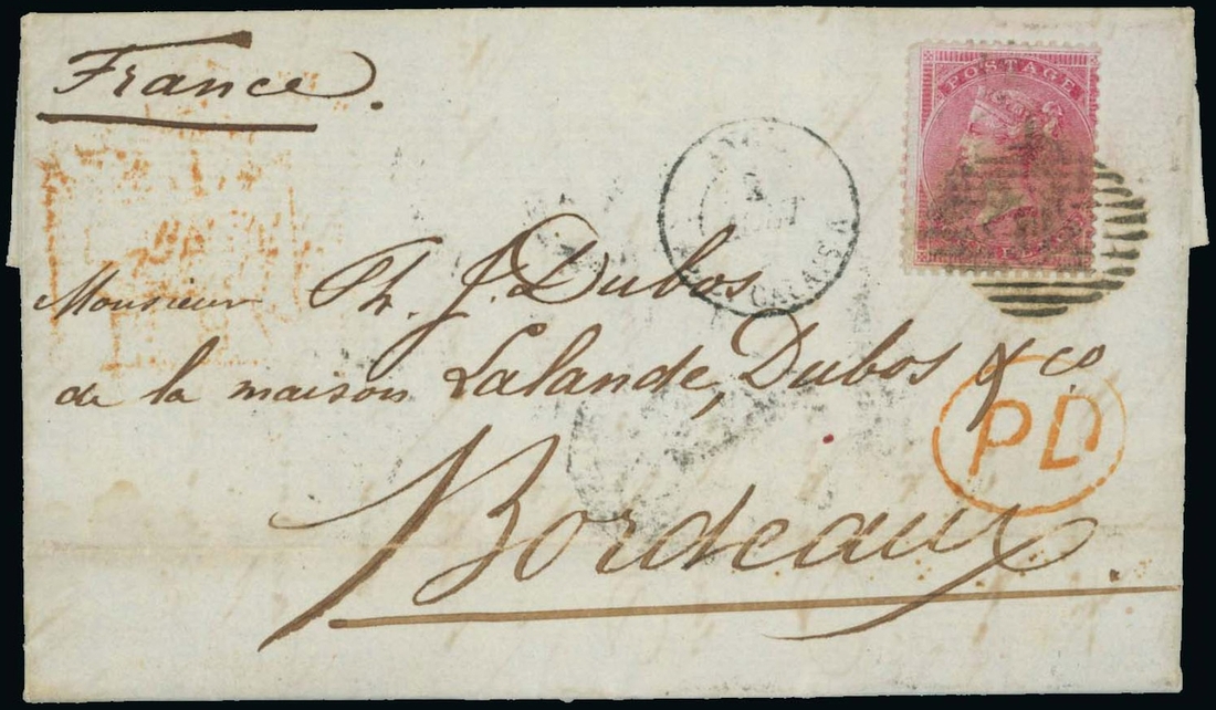 4d. carmine, slightly blued paper, tied by Inland Office numeral to 1855 (1 Aug.) entire letter to Bordeaux, the face with "
