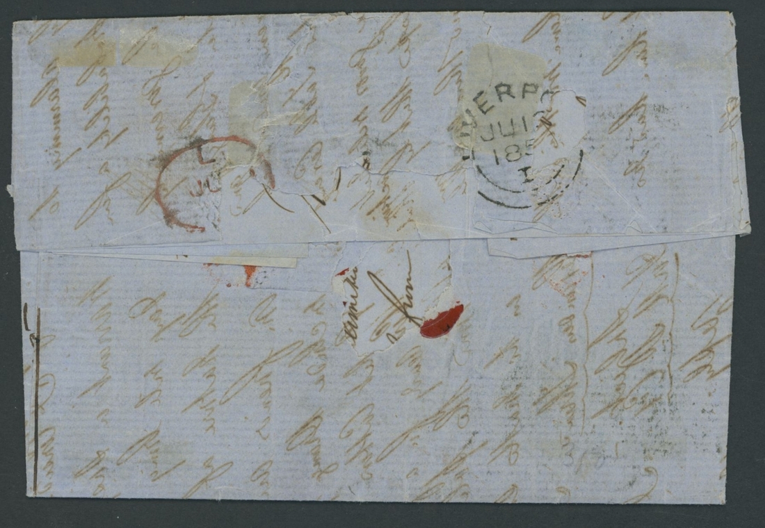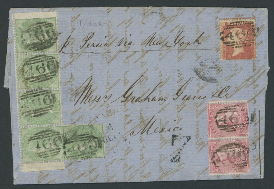 4d. horizontal pair, 1/- horizontal strip of four and single, and 1854-57 1d. red, all tied by '466' barred numerals to 1857 (12 July) from Liverpool to Mexico "P Persia via New York".  Filing fold crossing one 1/- and 4d. otherwise a remarkable and attractive franking.
