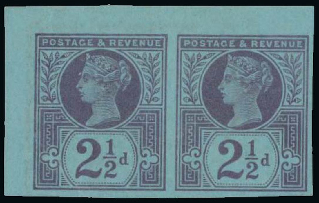 2½d. pale purple on blue paper horizontal pair from the upper left of the sheet, variety imperforate, large part original gum, very fine and possible the unique pair. S.G. 201var, Spec. K31(1)aa,  £22,000