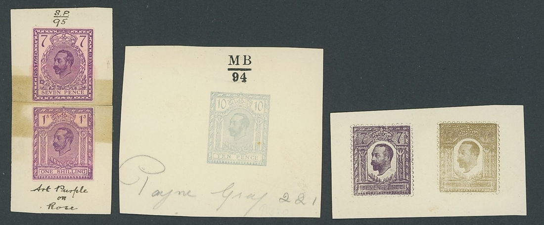A trio of trials: 7d. small format half tone essay, examples in blackish purple and bronze-green, printed together on piece of thin wove paper; 7d. and 1/- Hentschel trials in purple on pink wove paper, cut close and affixed to a piece of wove paper (30x62mm.) which shows ink manuscript "S.P./95" and "Art Purple on Rose" in the margins; and 10d. Hentschel trial on white wove paper (60x52 mm.) with handstruck "