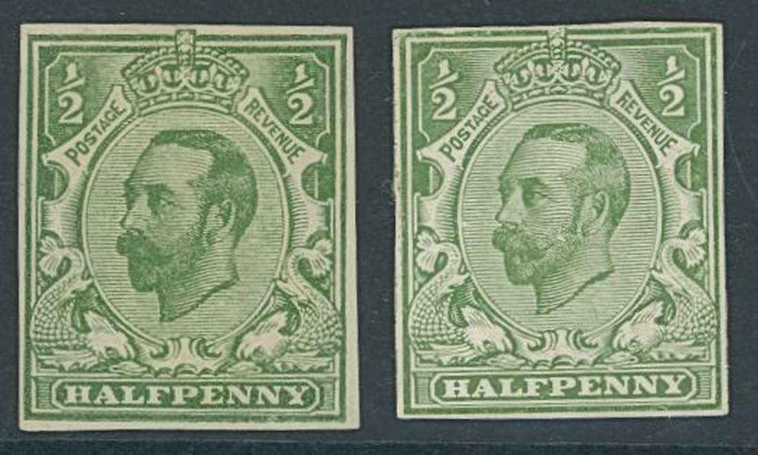 ½d. Die 1A die proof in dull yellow-green on unwatermarked glazed paper and die proof in dull green with uncleared borders on thick card; both cut to size and fine.  Spec. £7,000