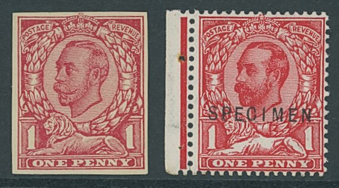 1d. Die 1b imperforate colour trial in carmine on white, unwatermarked and ungummed wove paper, good to large margins; also 1d. deep bright scarlet watermark Simple Cypher inverted overprinted "specimen" type 22 and showing variety white flaw above right value, slight bend otherwise fine.  A scarce duo.