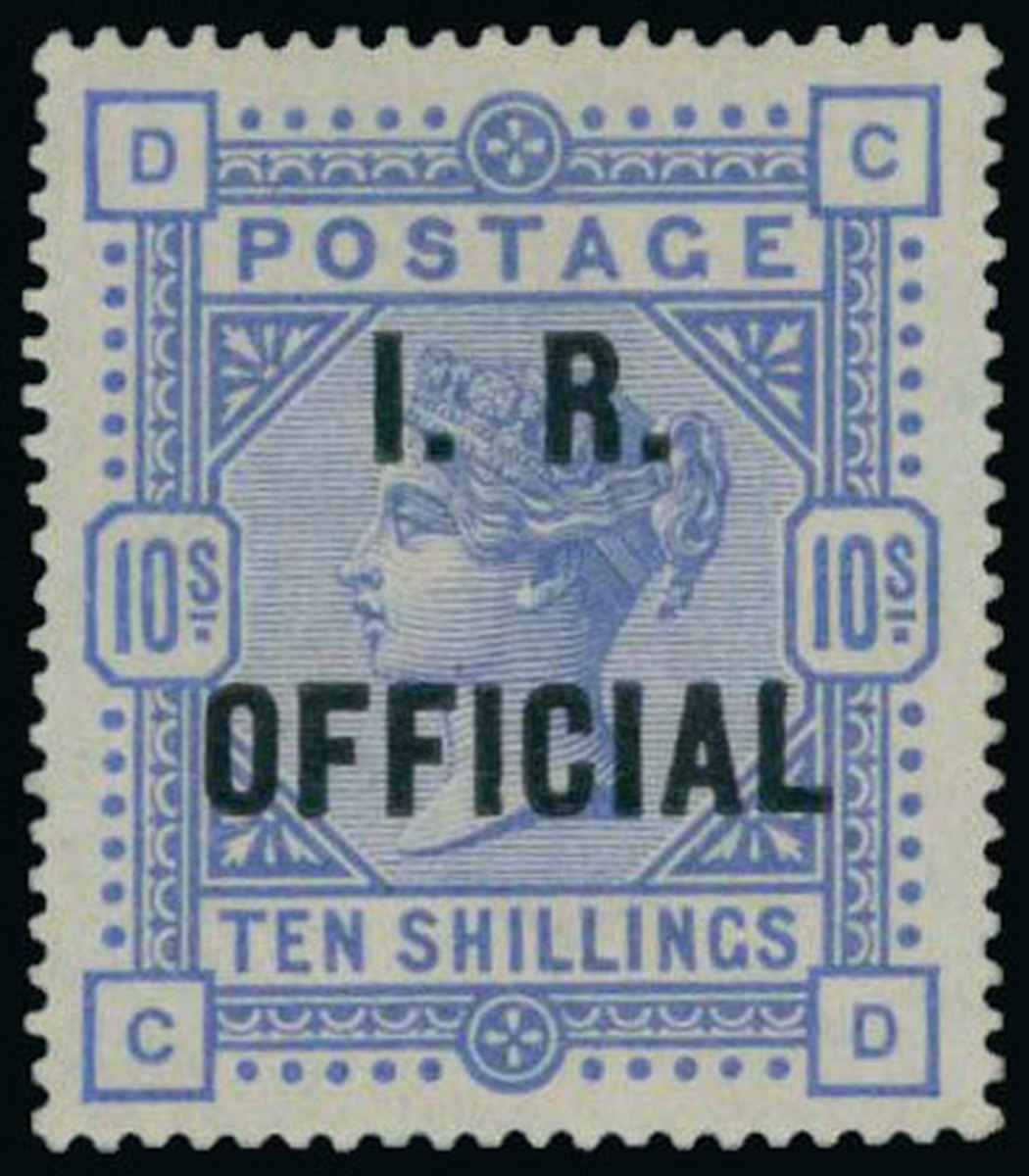 1884-88 10/- cobalt on white paper, CD, lightly mounted mint, very well centred and a beautiful example of this rare stamp. B.P.A. Certificate (1965) and small, indistinct handstamp on reverse. S.G. O9c, cb,  £18,000