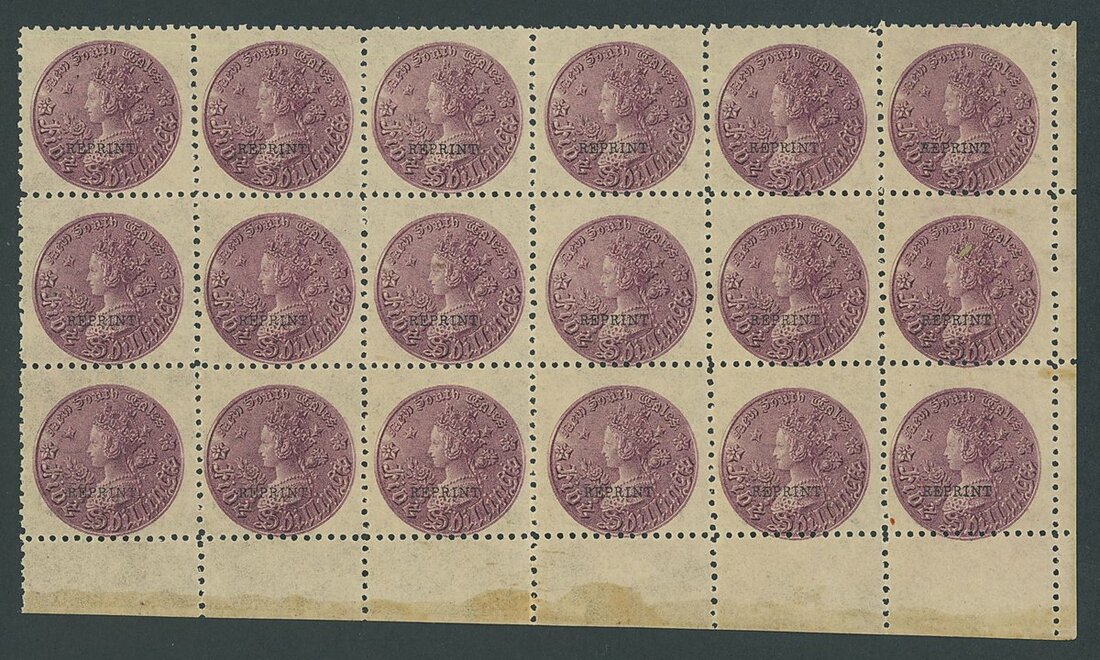 1861-88 5/- reddish purple, perf. 10, a lower-right corner block of eighteen, each overprinted