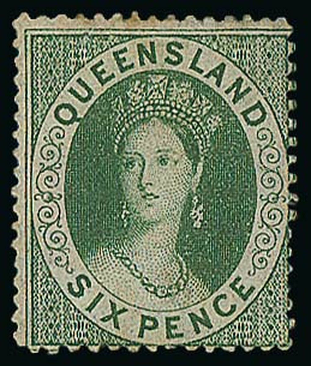 1860 watermark Large Star, clean-cut perf 14-16 6d. green, unused with part original gum, centred to lower right, fine. Rare. S.G. 6, £1,800. Photo