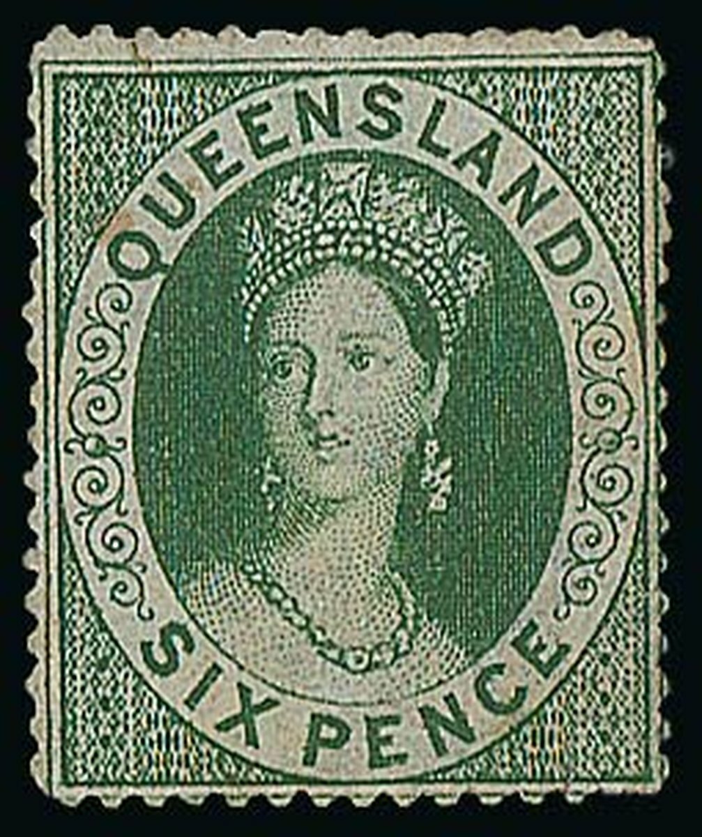 1860 watermark Large Star, clean-cut perf 14-16, 6d. green unused without gum, a couple of minor blemishes otherwise fine. S.G. 6, £1,800. Photo
