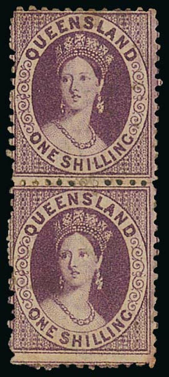 1868-78 watermark Crown and Q, perf 12 1/- purple vertical pair, unused with large part original gum, fine. S.G. 109, £500. Photo