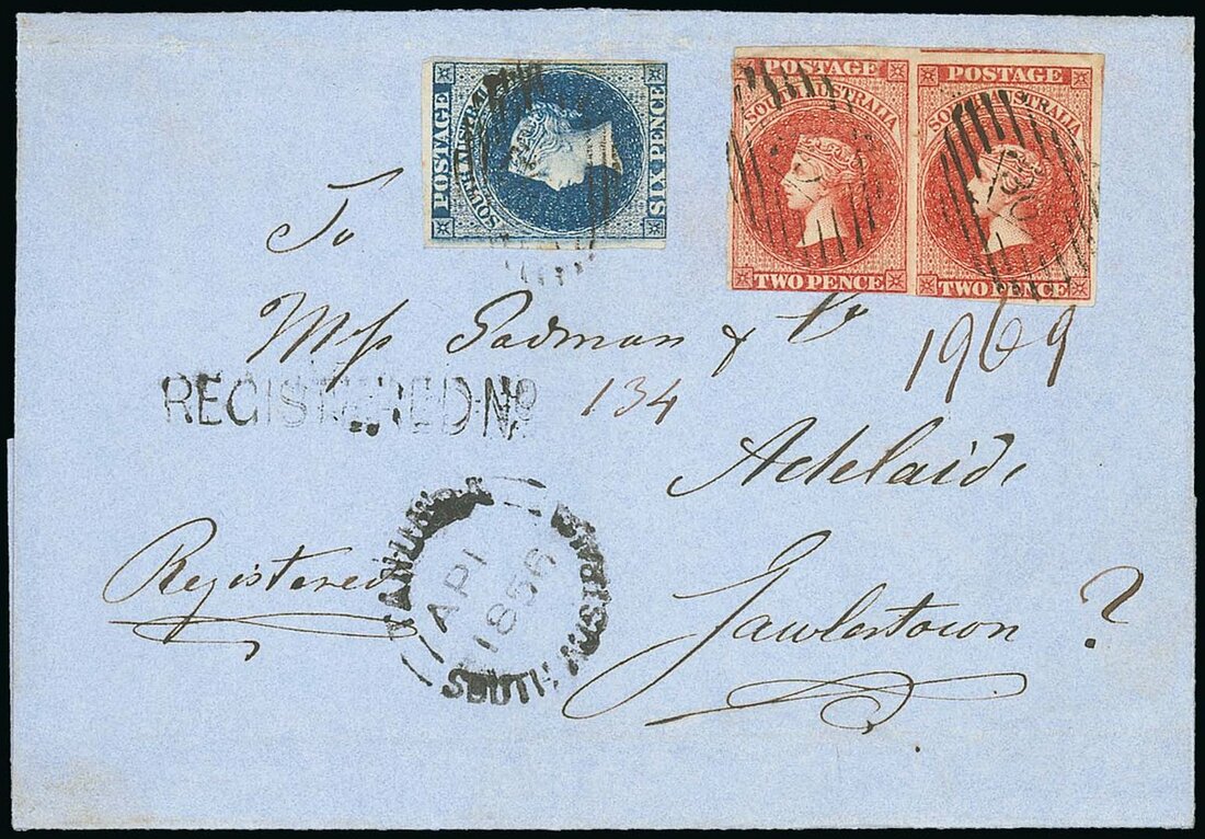 1856 (1 Apr.) entire registered from Tanunda to Gawler, bearing 1855 watermark Large Star, imperf 2d. rose-carmine pair (touched in places) and 6d. deep blue (touched at bottom left) cancelled "30", showing despatch and