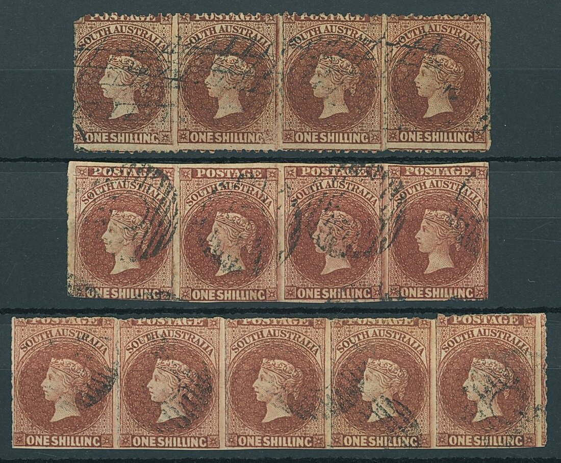 1860-69 second roulette, 1/- chestnut and 1/- lake-brown horizontal strips of four and five, and 1/- chestnut strip of five, all used, fine for multiples of this size and among the largest multiples recorded. S.G. 41, 41