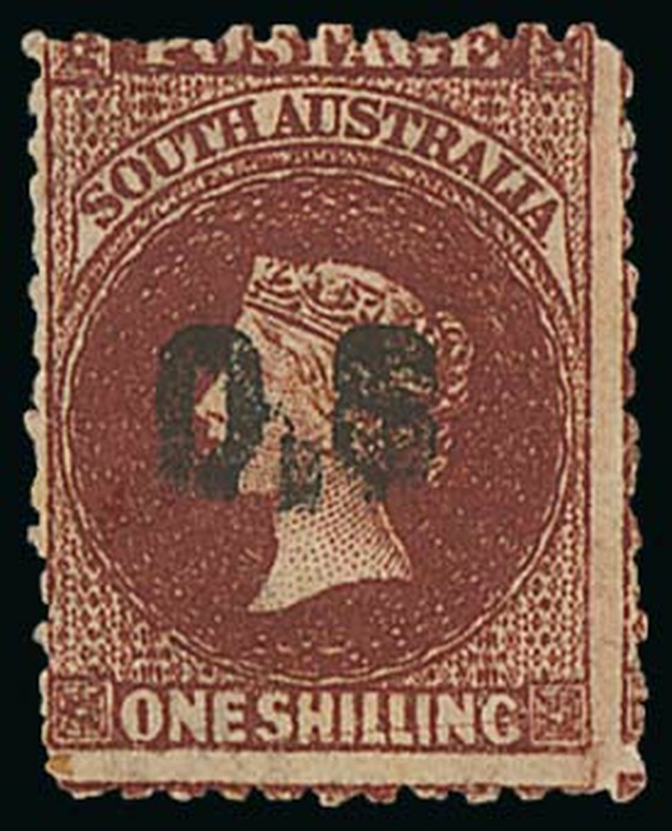 1878 perf 11½-12½ 1/- red-brown with error overprint double and missing stop after "S", unused with large part original gum, fine. Unique for this stamp and for any other South Australia "O.S." stamps. S.G. 27c var. (normal double catalogues £950 for used). Photo