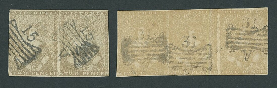 1851 Eighth printing, 2d. cinnamon strip of three with close margins all round, each cancelled by Butterfly "31" of The Grange, fine with strips of three being the second largest multiple recorded; also 2d. olive-drab pair with close margins, both cancelled by Butterfly "15" of Geelong, fine and also the second largest multiple recorded. Both with RPSV Certificate (2017). S.G. 17, 17d