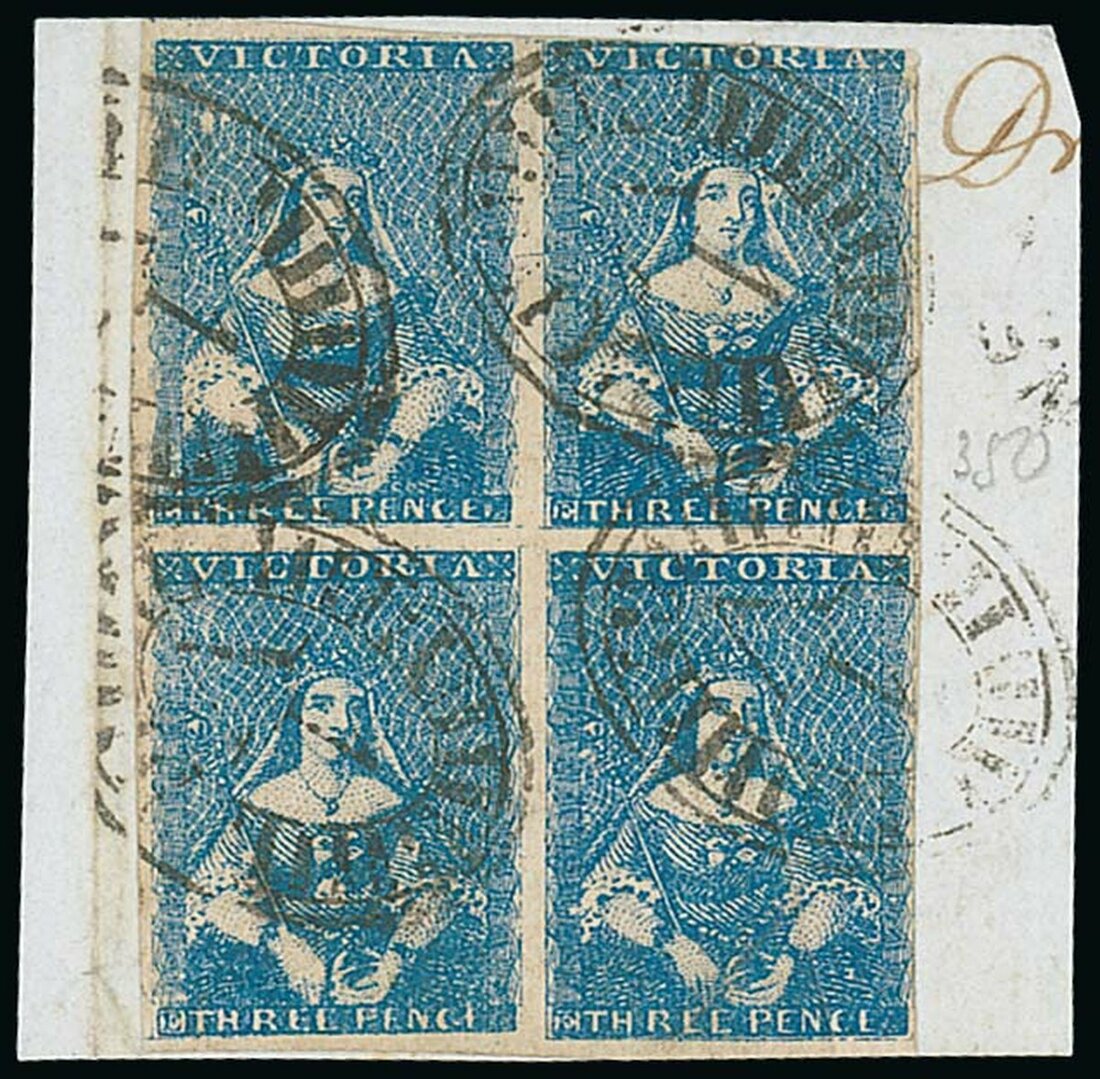 1854 Campbell 3d. blue block of four, [14-15/20-21], margins mostly all round, on piece (lifted and hinged back) tied by Barred Oval "1", fine. A rare block. RPSV Certificate (2020). S.G. 24. Photo