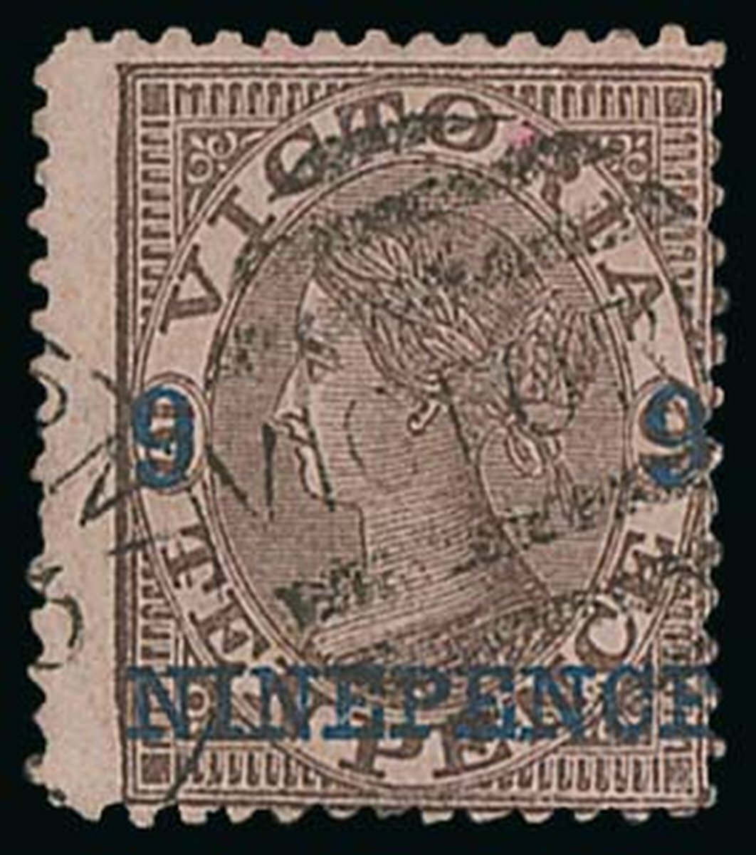 Note:: Geoff Kellow states at page 175 that amongst the final two printings of the 10d. Laureate (the ones used for surcharging) "a high proportion of inverted, reversed, and inverted and reversed watermarks [are] found. However, Kellow does not mention watermark sideways.