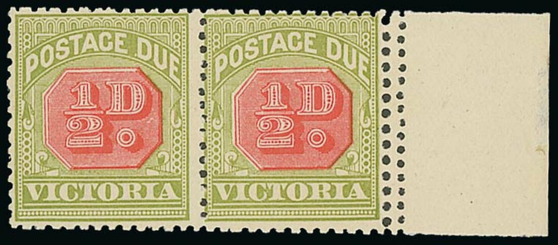 1905-09 watermark Crown over A inverted, ½d. scarlet and pale yellow pair with margin at right, showing error mixed perforations 12½ and 11 at right, superb unmounted mint. Rare, about six examples recorded. RPSV Certificate (2024). BW VD39a, $2,500; S.G. D34ba, £1,600. Photo