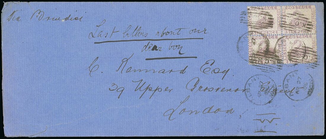 1886 (27 Apr.) blue envelope (225x95mm.) to London with embossed