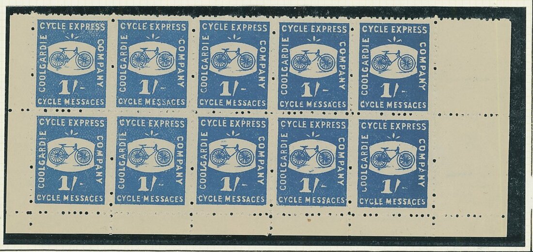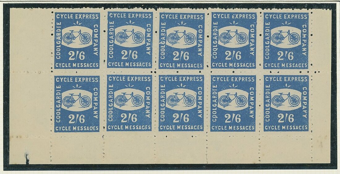 1894 1/- and 2/6d. marginal blocks of ten (5x2) being the bottom two rows of the sheet, the 1/- without gum and the 2/6d. partially affixed to Hawid strip, 1/- and 2/6d. top right corner vertical strips of three, both partially affixed in stockcard, 1/- (3) and 2/6d. (2) singles without gum, plus a James Healy trade card and a newspaper advertisment from the "Coolgardie Times"