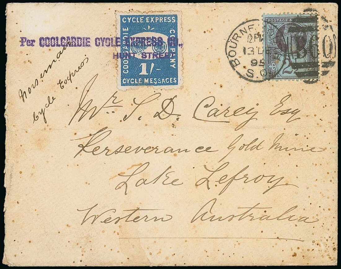 1895 (13 Dec.) envelope to Perserverance Gold Mine, Lake Lefroy, marked "Norseman Cycle Express", bearing GB 2½d. tied by Bournemouth "B60" duplex and Cycle Express 1/- tied by "Per
