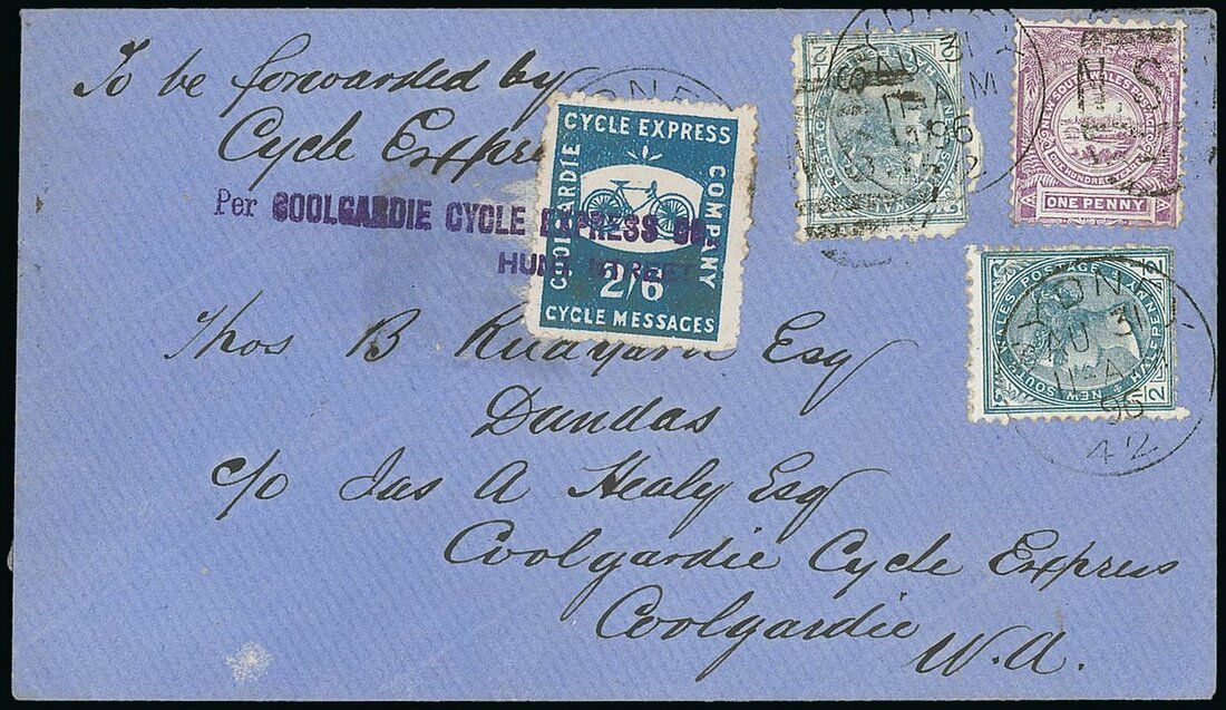 1896 (31 Aug.) blue envelope to Dundas, c/o/ A. Healy Esq, Coolgardie Cycle Express, Coolgardie, marked "To be forwarded by Cycle Express", bearing New South Wales ½d. (2) and 1d. tied by Sydney duplex, and Cycle Express 2/6d. tied by "Per
