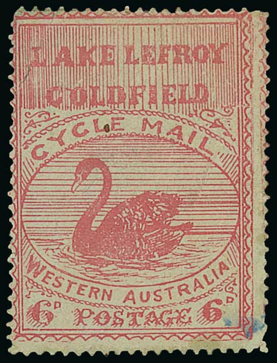 1897 (Apr.) 6d. pink on greenish paper, unused with large part original gum (sweated), good colour, light corner crease, black spot on face and some blue marks at lower right, nevertheless a presentable example of this rare stamp; also two page 1896 (14 Feb.) letter from the Palace Hotel written by Frank Maskell (addressee's name and address excised) in which he writes about the service - "The Lake Lefroy Cycle Service after a career of about 4 months from Feb. to June 1897, has ceased to ??? since the latter date; there is now a Govt subsidised mail-coach running bi-weekly to Red Hill the new township & centre of the district. In February last year there was a big alluvial "rush" to the place & and in company with Mr. H.L. Hillier, I started the cycle service between the rush & Coolgardie 45 miles distant, we made a charge of 6d. per letter each way for posting and collecting them at the Coolgardie Post Restante and in April we had these stamps printed.". Photo