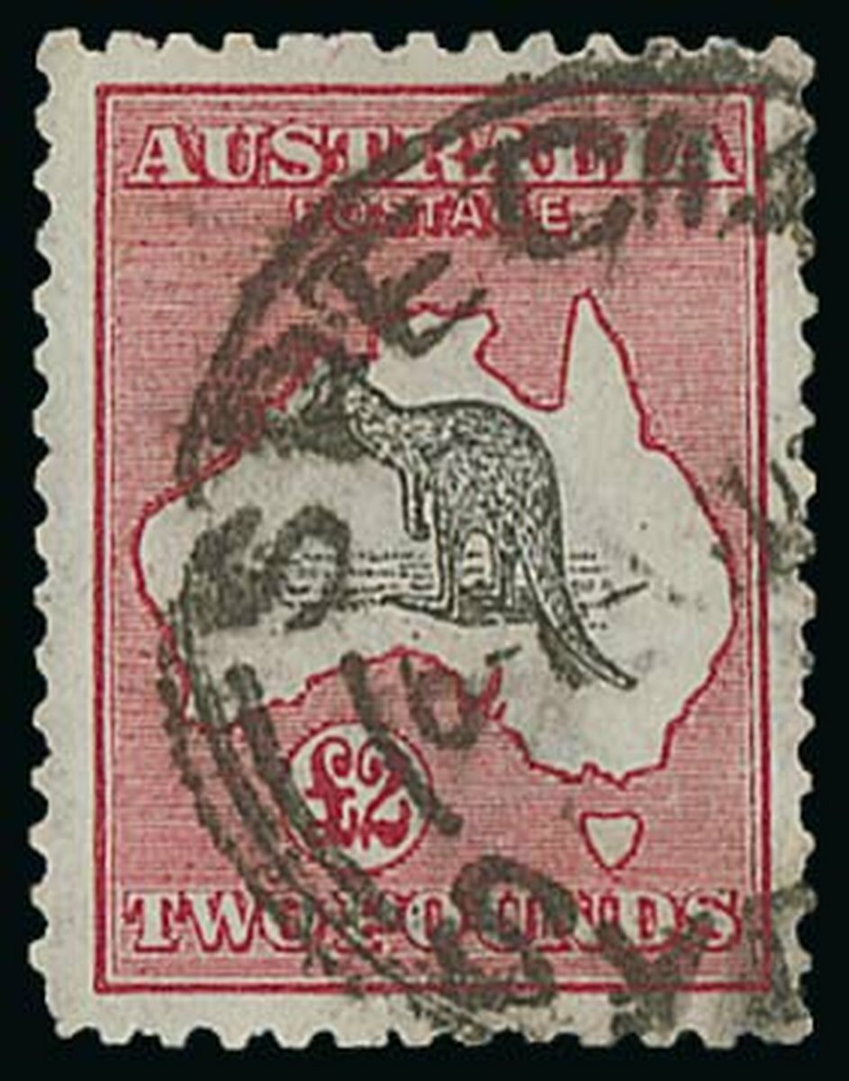 1915 Third watermark £2 black and rose with Sydney datestamp; blunt perf. at lower left, otherwise well-centred and fine. S.G. 45, £3,250. Photo