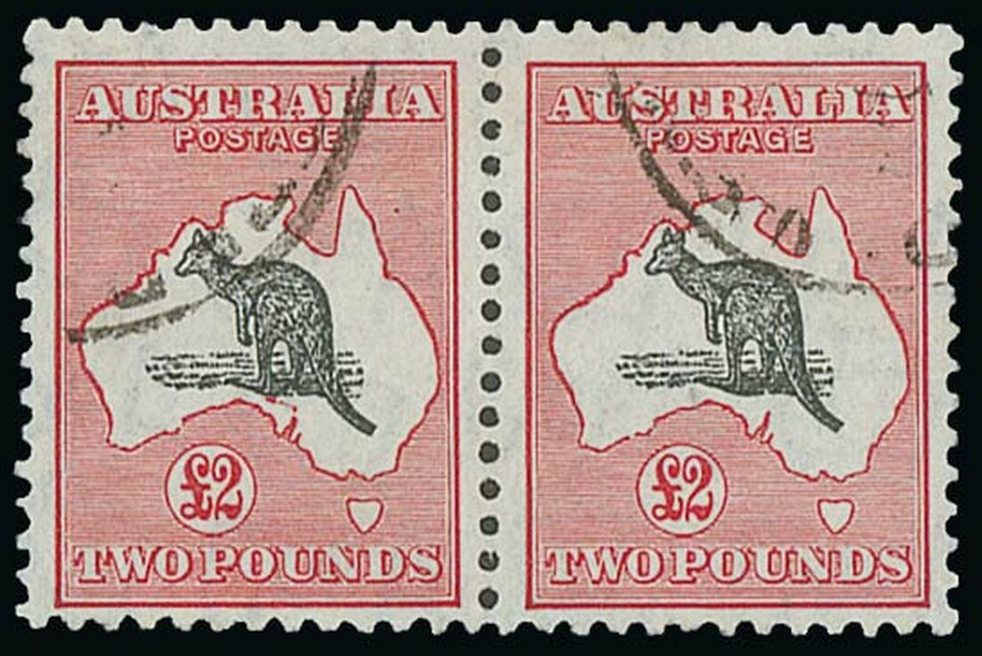 1931-36 CofA £2 black and rose pair, the right stamp showing red coloured line extending left of Spencer's Gulf, fine used. BW 58Dl; S.G. 138, £1,300. Photo