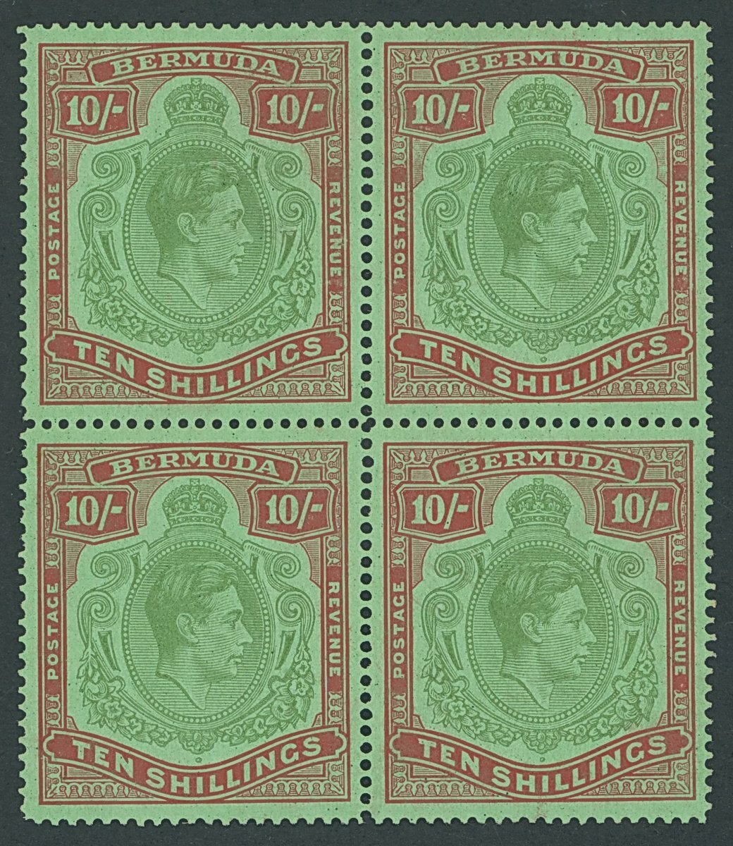 10/- perf. 14¼ line perf. yellow-green and carmine on green, a block of four showing broken shading line at point it touches the King's upper lip (HPF 28a), mounted on the upper pair only, fine. S.G. 119b var., £2,000+