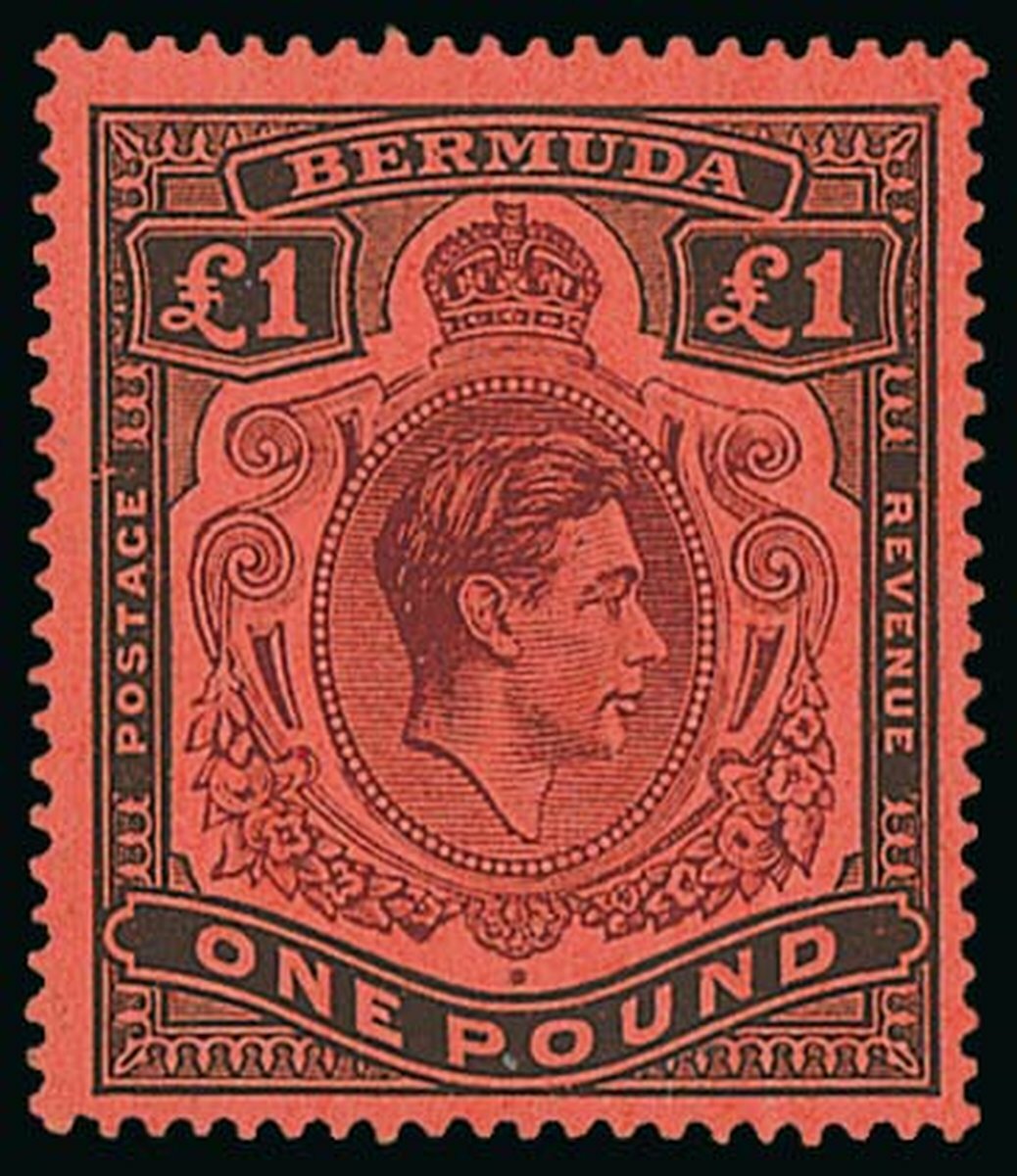 £1 purple and black on salmon-red, variety shading omitted from top-right scroll, faint paper buckle at upper left not affecting the appearance, a fine example of this rare printing flaw; lightly mounted mint. R.P.S. Certificate (1987). S.G. 121cb, £2,500. Photo