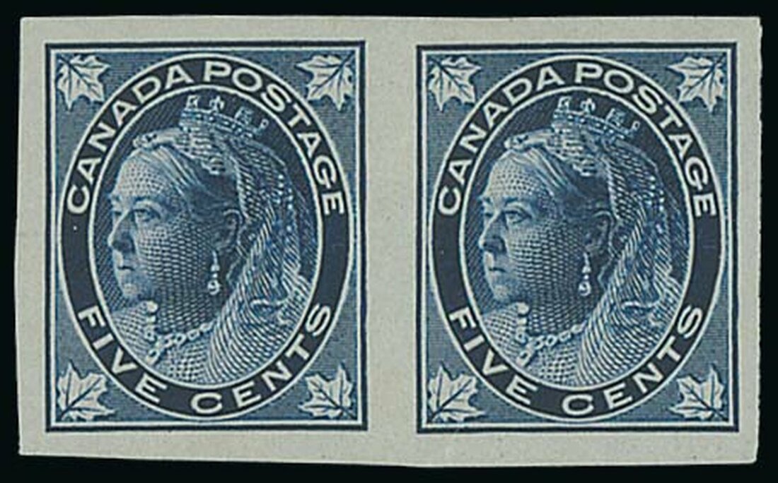 1897-98 5c. deep blue horizontal pair on bluish paper, variety imperforate, large part original gum; fine. R.P.S. Certificate (2012). S.G. 146a, £475. Photo