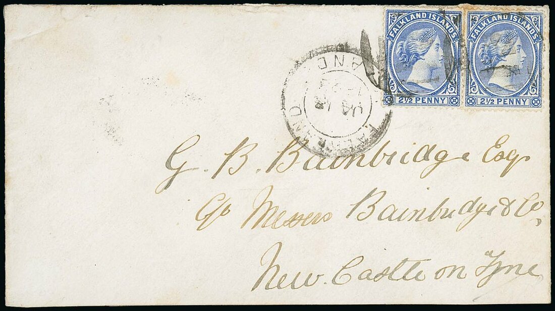 1893 (18 Jan.) Bainbridge envelope to Newcastle-on-Tyne, bearing 2½d. ultramarine (2) for 1oz., cancelled by "Pointed Nose F.I." cork (Barnes 1/93) with F.2 dispatch alongside; hinge remainder on reverse and minor peripheral faults, but still an attractive usage. Carried by the H.M.S. Magpie and the first mailing with this cork. Photo.