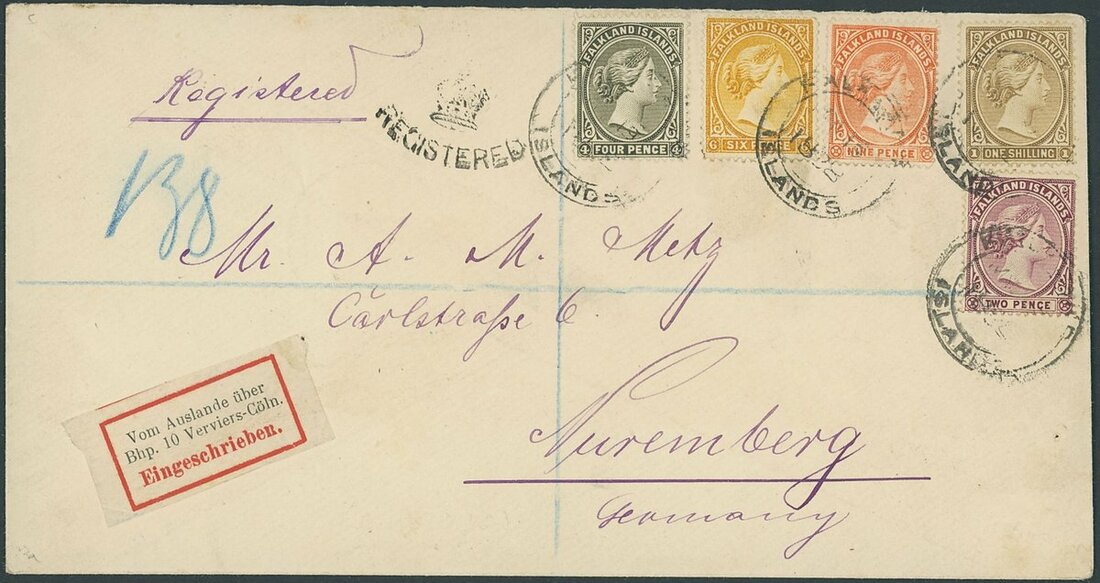 1898 (19 May) envelope registered to Germany, bearing 2d., 4d., 6d., 9d. and 1/-, each tied by Type F.1 c.d.s., with Crown Registered h.s. and German registration label on face, Nuernberg arrival on reverse. Carried by Kosmos line vessel S.S. Neko; fine.