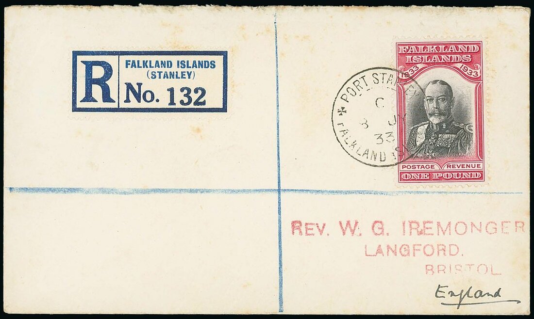1933 Centenary £1 black and carmine on Ironmonger envelope registered to Bristol, cancelled by fine Port Stanley c.d.s. (Heijtz PS.1B), Stanley registration label alongside; some light foxing, but an attractive and rare cover. S.G. 138, £3,750. Photo.