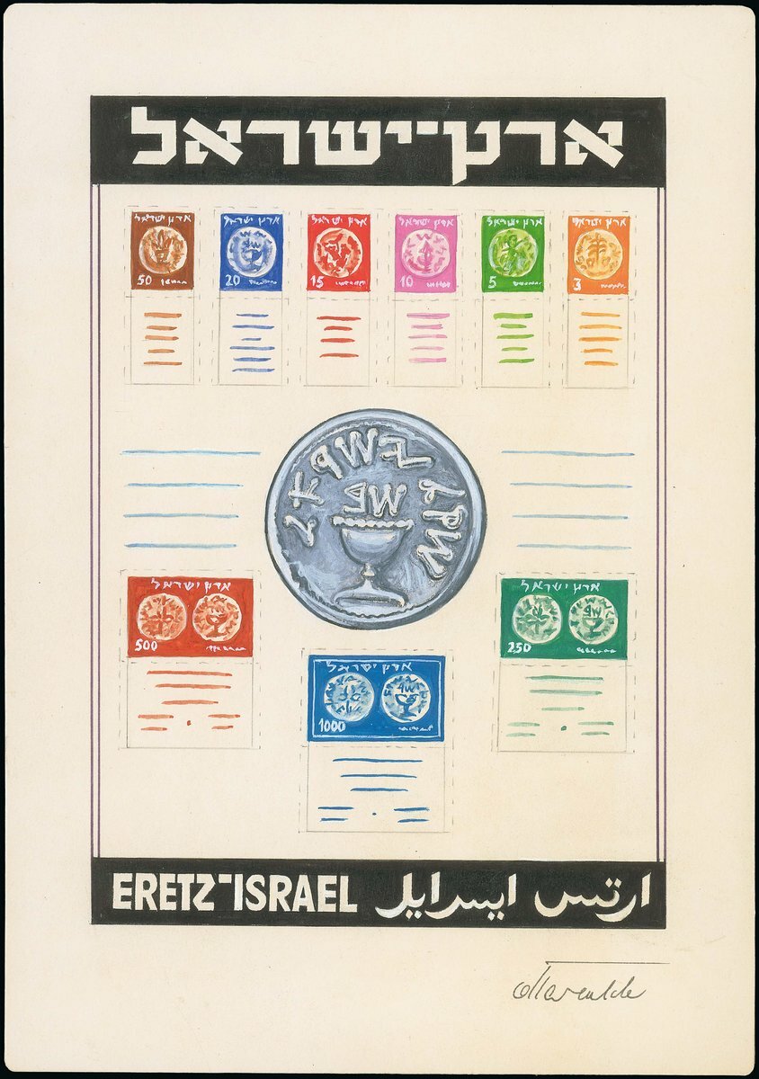 1948 hand-painted multicoloured artist’s sketch for minister sheet (157x228mm) with complete set of nine, each in approved colours and inscribed “Eretz Israel”, at top in Hebrew and at base in English. On off-white card with grey backing (206x294mm), signed by the designer, Otto Wallish, at lower right, believed to be unique. The ideal frontispiece of any Israel collection, Ury Shalit certificate (2013). Photo