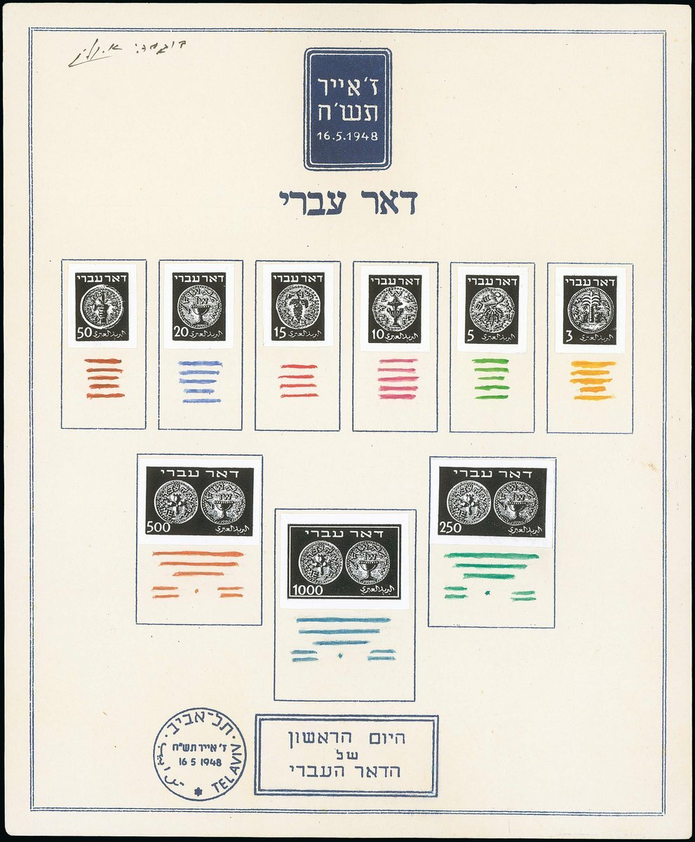 1948 hand-painted artist’s sketch for minister sheet (205x252mm) in blue, showing at top date and at base simulated “First Day” cancellation and with black on white glazed paper cut-outs (3m. to 1000m.) from the