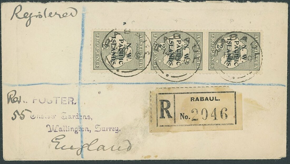 1919 (14 Aug.) envelope registered to England, bearing 2d. grey "abc" strip of three tied by