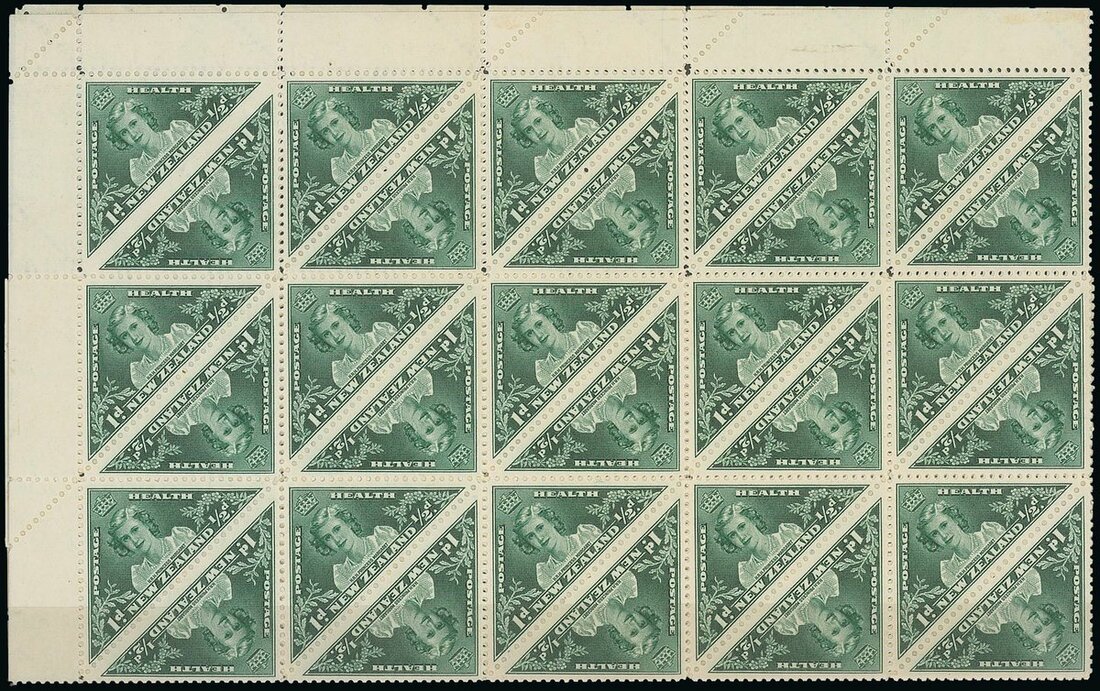 1943 (1 Oct.) Health 1d. +½d. green, an almost complete sheet of one-hundred and eighteen (missing just one pair, and folded for exhibition) and showing variety imperforate between at upper left corner of the sheet; full original gum, a striking and extremely rare variety, particularly rare as part of the entire sheet. Brandon (1992) and Murray Payne (2011) Certificates. S.G. 636a, £15,000+. Photo