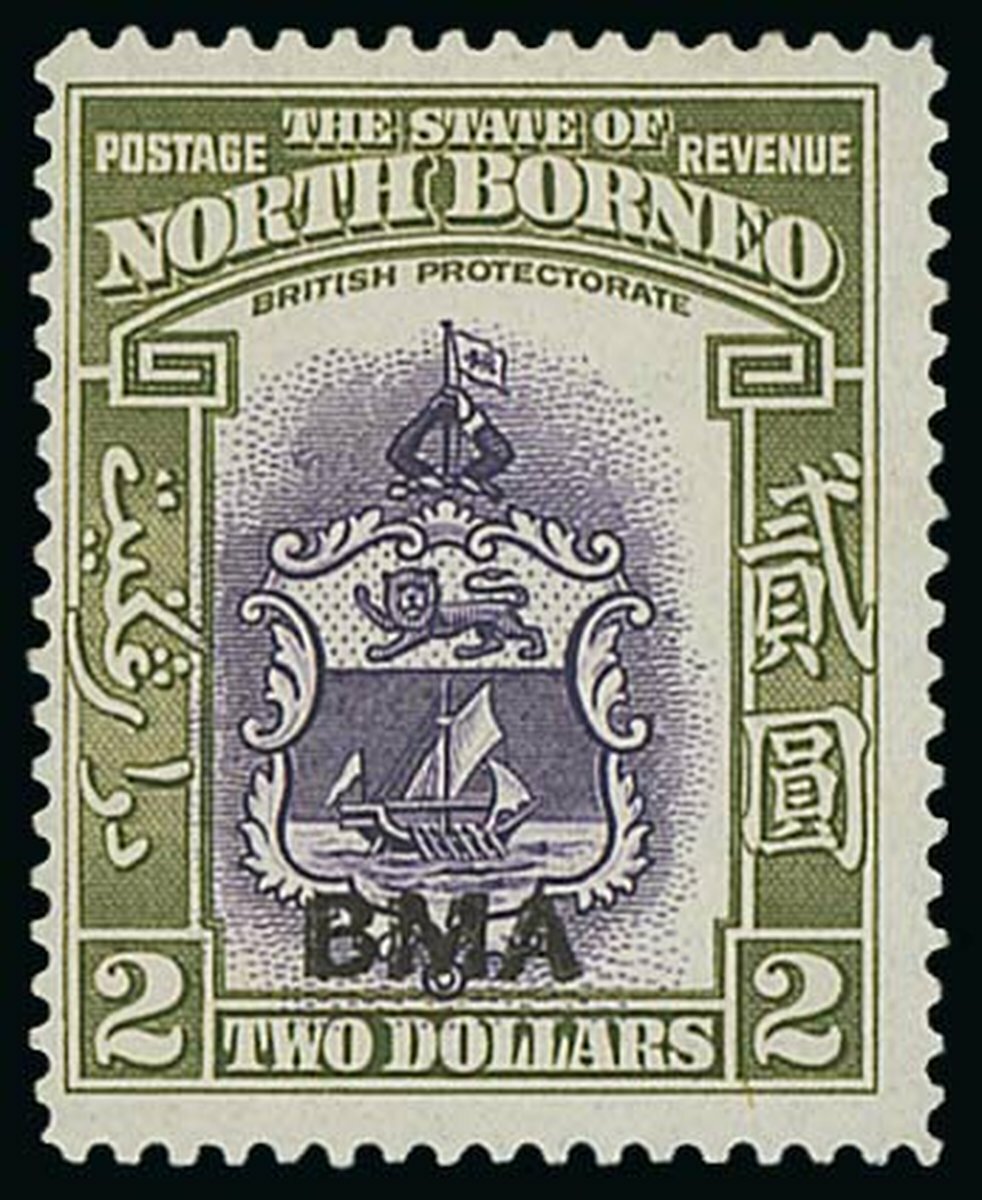 1945 BMA $2 violet and olive-green, variety overprint double, lightly mounted mint; rare. Murray Payne Certificate (2007). S.G. 333a, £4,500. Photo