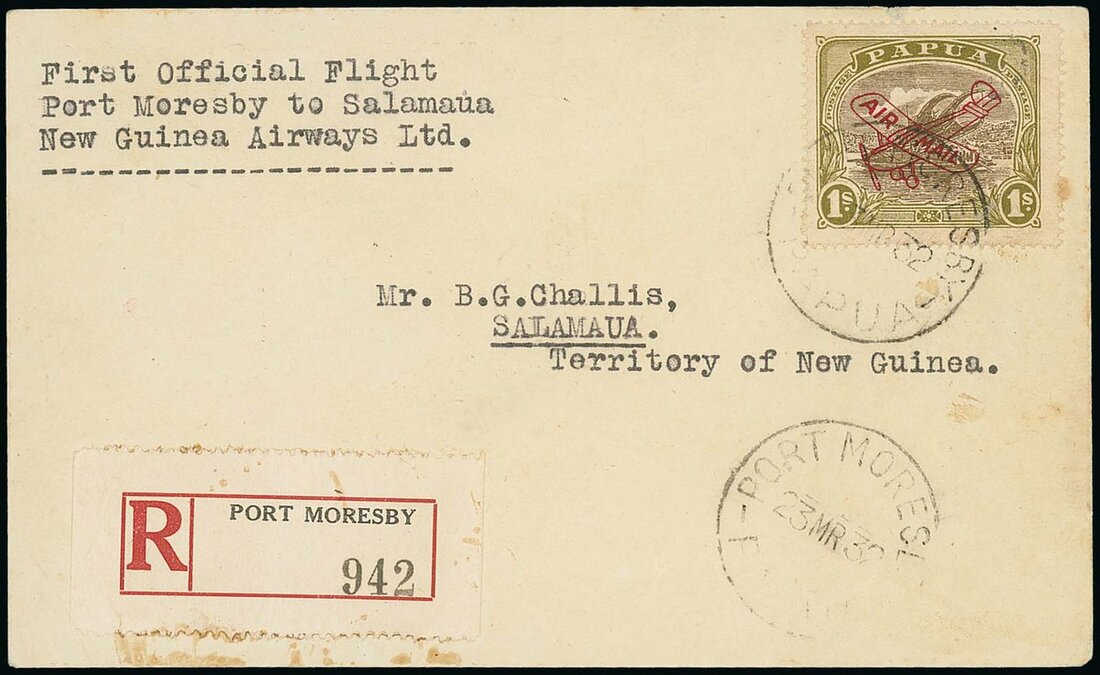 1932 (23 Mar.) envelope registered from Port Moresby to Salamaua, marked "First Official Airmail, Port Moresby to Salamaua, New Guinea Airways Ltd." and bearing 1930 Air 1/-. AAMC P44 - 57 items carried. Photo