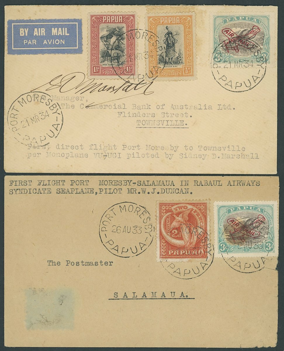 1933 (26 Aug.) envelope flown on Rabaul Airways Syndicate seaplane from Port Moresby to Salamaua and franked at 5d.; and 1934 (21 Mar.) envelope carried on first direct solo flight from Port Moresby to Townsville, franked at 5d. and signed by pilot, Sidney Marshall. AAMC P65/66, 69a