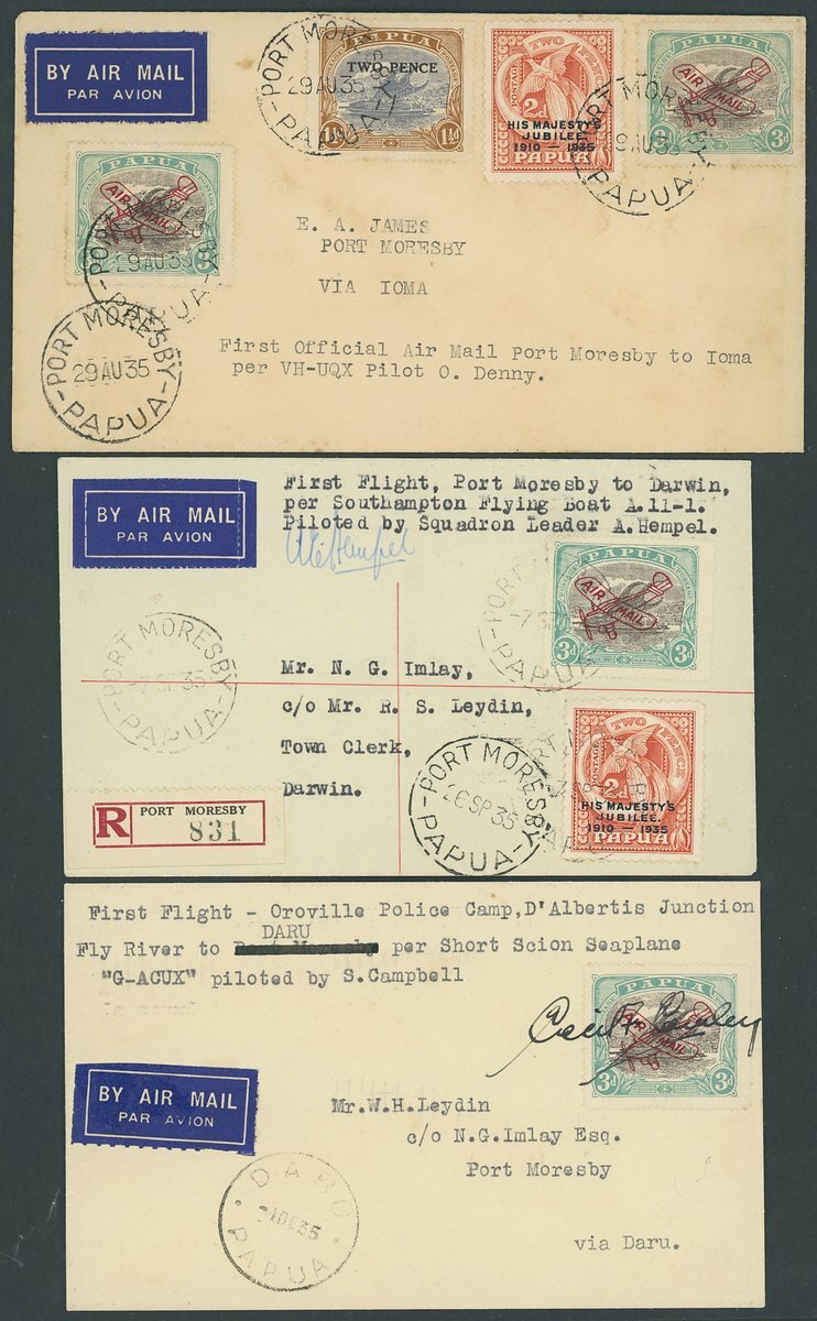 1935 (29 Aug.) envelope carried on first official flight from Port Moresby to Ioma franked at 10d.; (7 Sept.) envelope carried on first flight from Port Moresby to Darwin, franked at 5d. and signed by pilot, A. Hempel; and (27 Nov.) envelope carried on first flight from Oroville Police Camp to Daru, franked at 3d. and signed (across adhesive) by pilot, Cecil Cowley