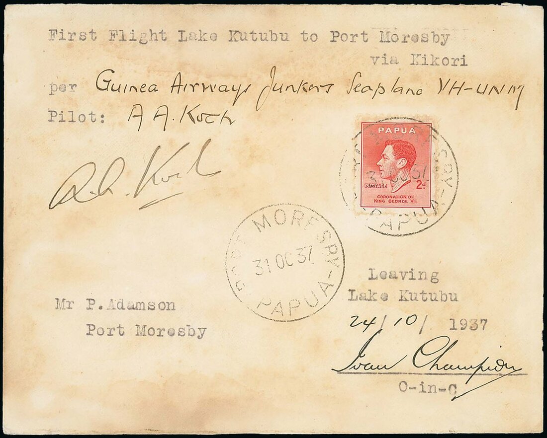 1937 (31 Oct.) envelope flown by Guinea Airways from Lake Kutubu to Port Moresby, franked at 2d., signed by pilot, Aubrey Koch and by Ivan Champion, the Officer in Charge of the Lake Kutubu Police Camp; some light overall discolouration. AAMC P121 - only 17 flown covers. Photo
